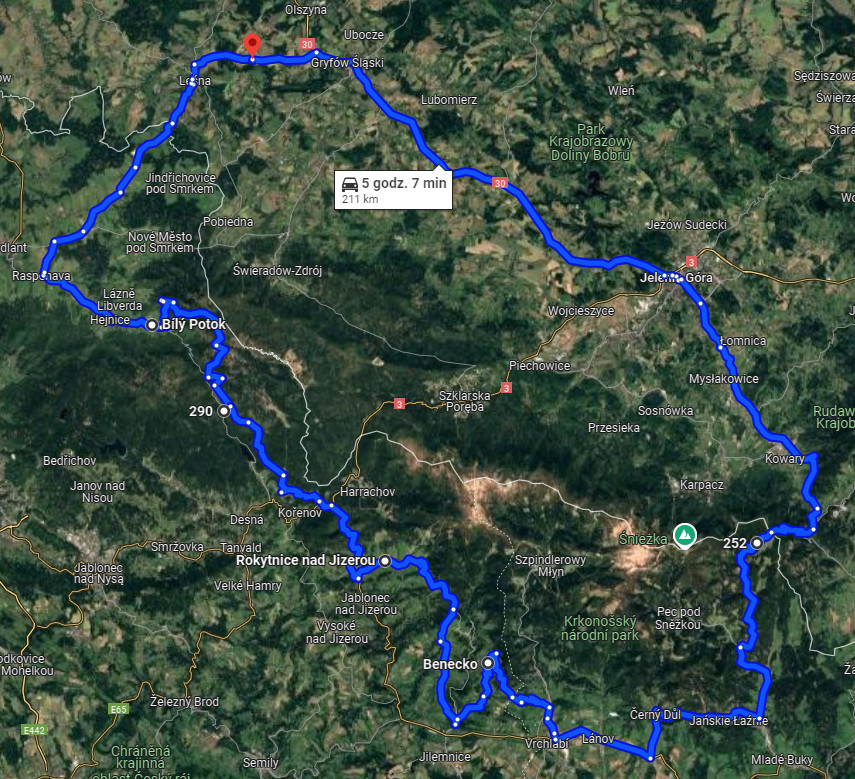 2. Trasa około 211km, jeśli pozwolą na to warunki, gdyż na okres zimowy zamykana jest droga II/290 na odcinku Desná, Souš – Smědava i na chwilę obecną jest już zamknięta.